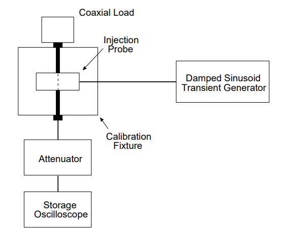 - Calibration fixture: Coaxial transmission line with 50 ohm characteristic impedance, coaxial connections on both ends, and space for an injection probe around the center conductor