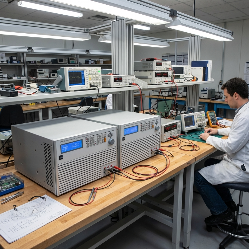 - Fully integrated battery cycler: built-in isolation contactor relays, pre-charge circuit, reverse polarity checker